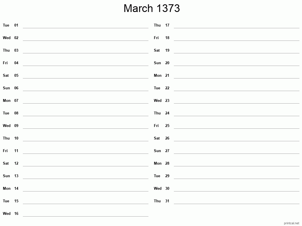 Download Two Column Notesheet calendar for March 1373 to help you with your productivity and manage your time efficiently. To change first day of the week to Monday, click here.