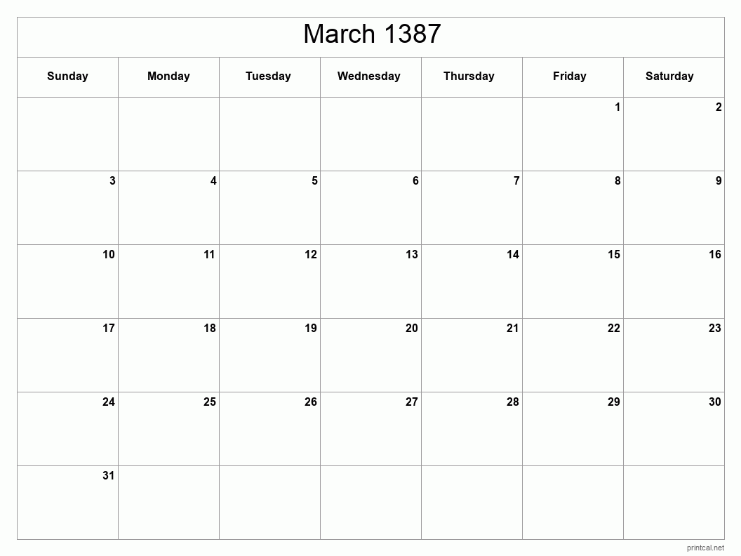 Printable March 1387 Calendar (Classic Blank Sheet)