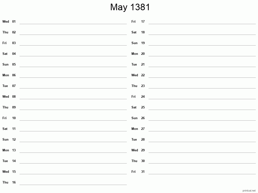 - May 1381 Calendar - Classic Blank Sheet