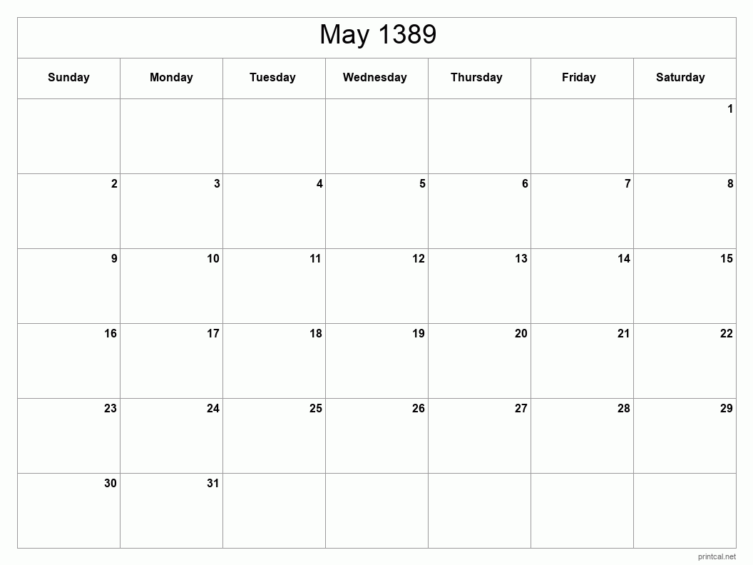 Printable May 1389 Calendar (Classic Blank Sheet)