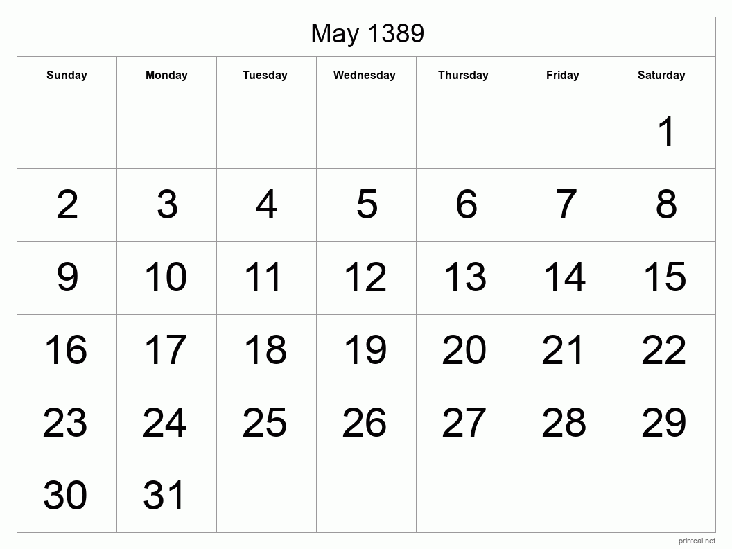 Printable May 1389 Calendar (Big Dates)
