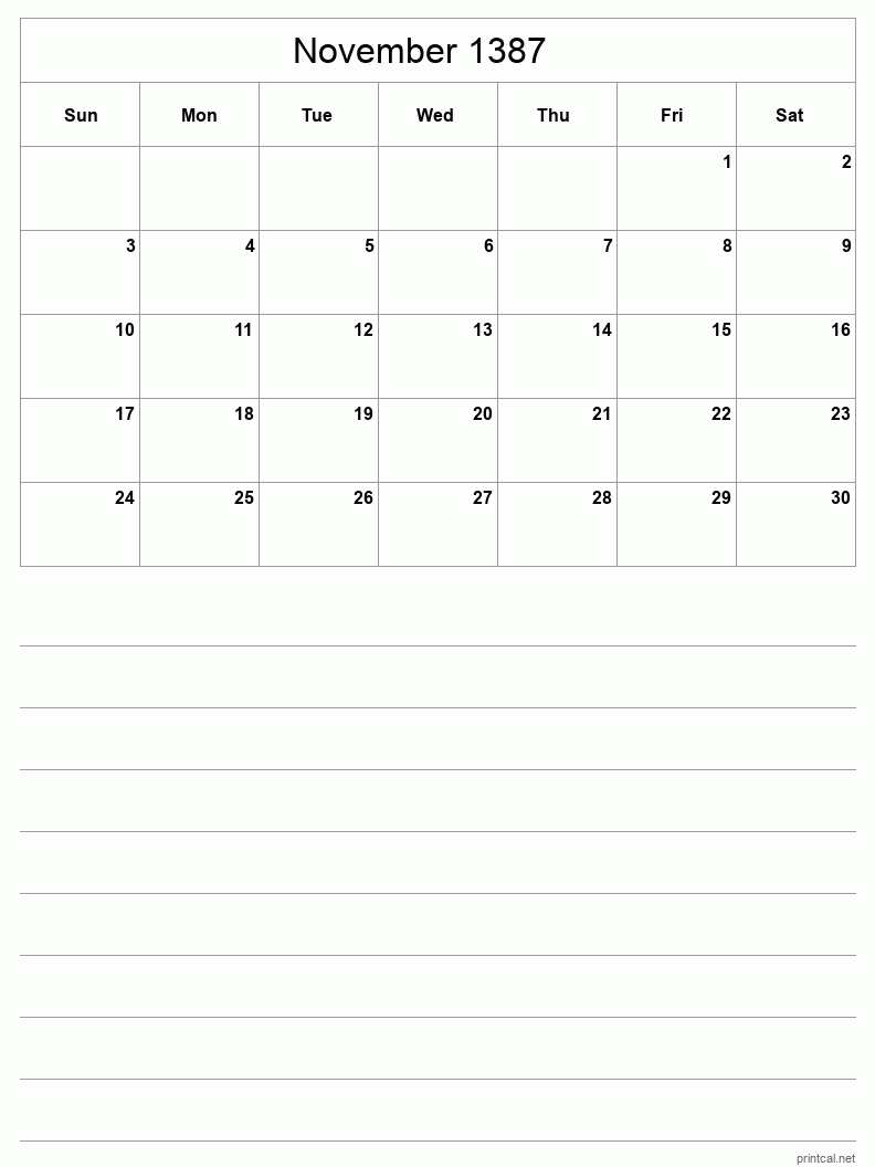 Printable November 1387 Calendar (Half-Page With Notesheet)
