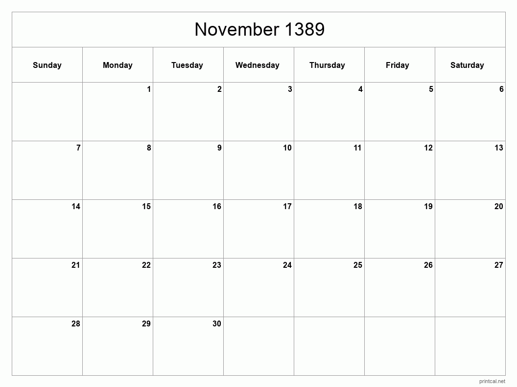 Printable November 1389 Calendar (Classic Blank Sheet)