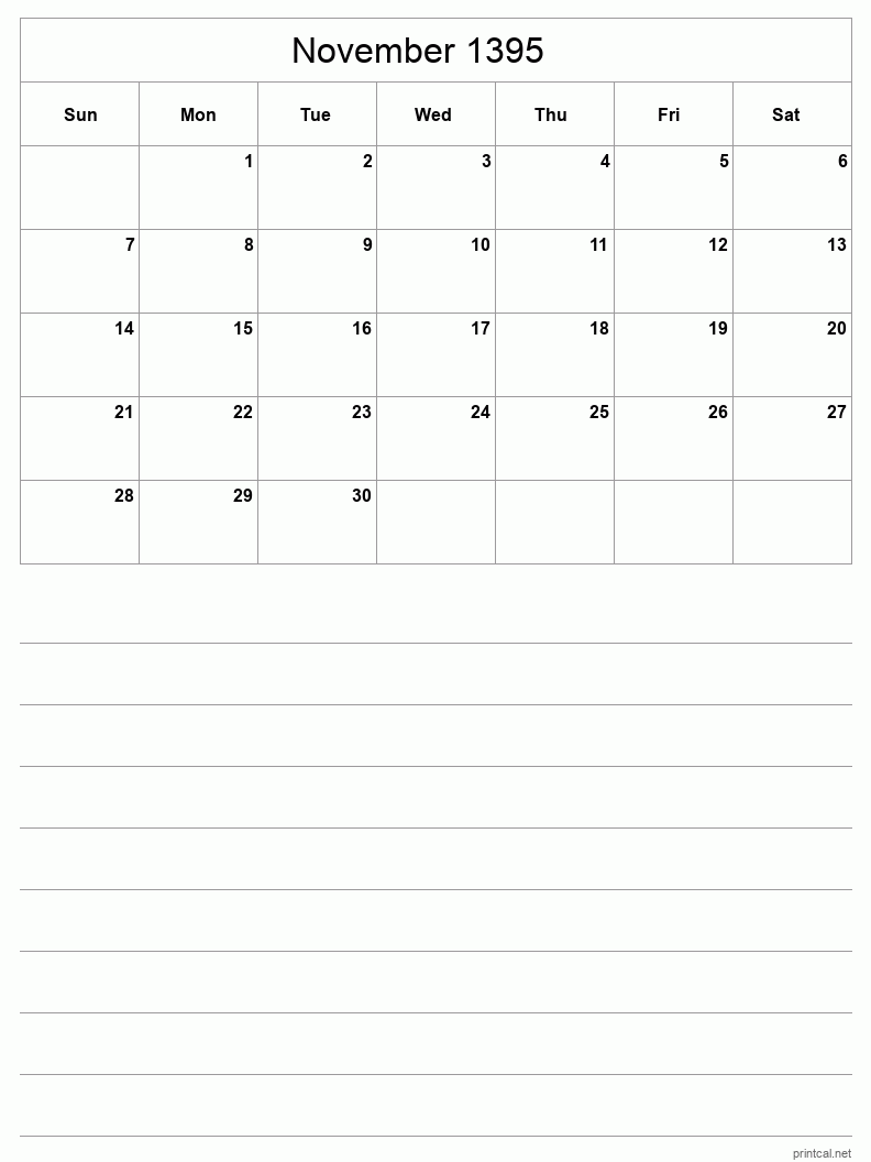 Download Half-Page With Notesheet calendar for November 1395 to help you with your productivity and manage your time efficiently. To change first day of the week to Monday, click here.